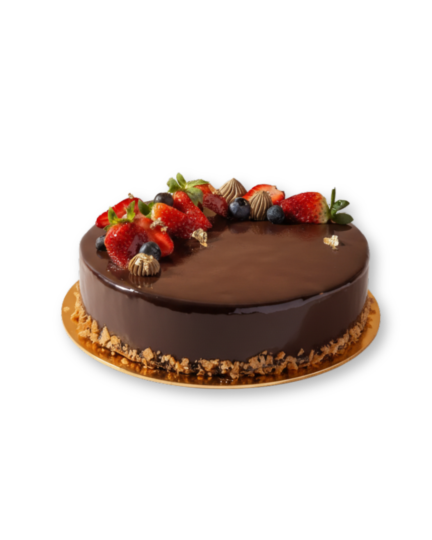 Smooth and creamy mousse cake with layers of chocolate mud cake, chocolate mousse, raspberry fillings and raspberries, topped with chocolate glaze, fresh strawberries, blueberries and chocolate fresh cream. Chocolate lovers new best friend indeed!