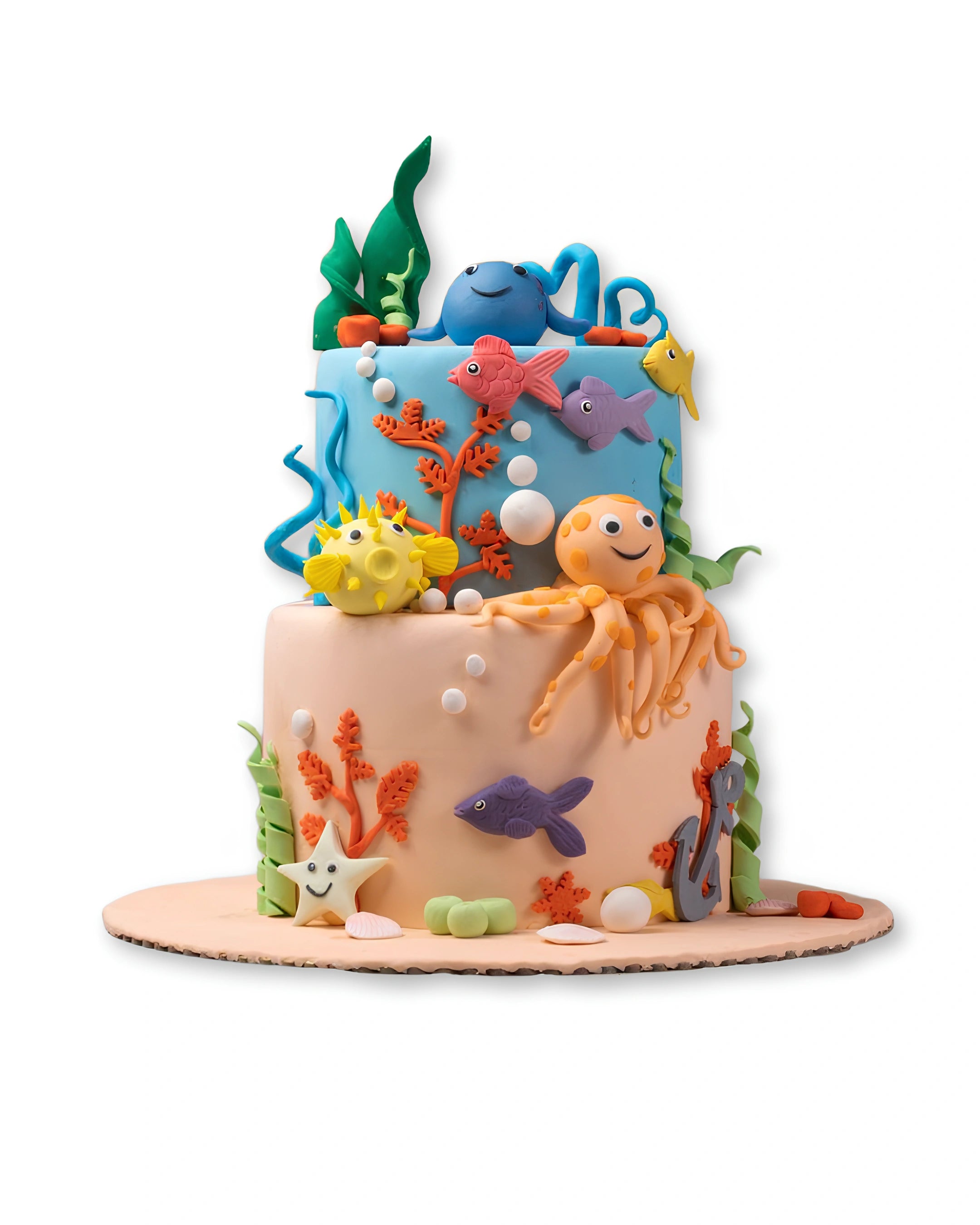 Dive into an oceanic celebration with our Marine Adventure Cake, a masterfully crafted dessert that brings the wonders of the sea to your table. This stunning creation features intricate fondant work depicting vibrant coral reefs, playful sea creatures, and shimmering waves in rich blues and teals.